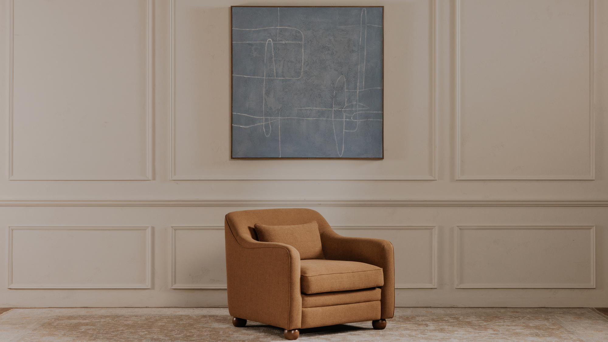 The Notion framed painting embodies elegant simplicity. This minimalist abstract artwork draws you in with its calm blue backdrop and flowing gestural lines, offering a serene visual experience. The textured acrylic paint adds rich depth to the canvas. Crafted with a sturdy pine frame and ready to hang with included hardware, it arrives fully assembled for effortless display.