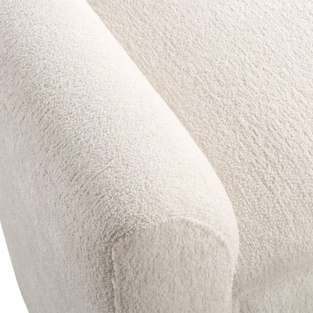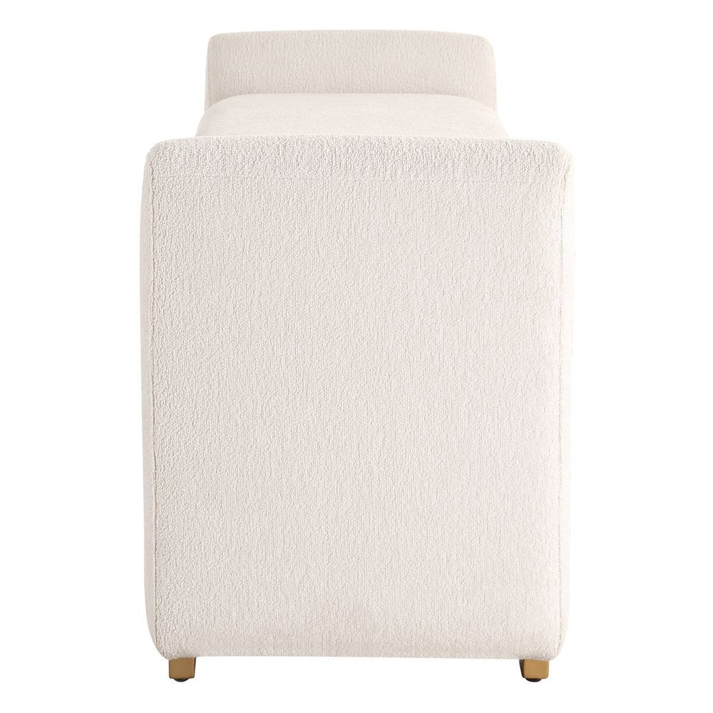 The Caliste bench offers a warm and sophisticated appeal, featuring elegant upholstery in ivory textured boucle polyester. It is beautifully accented with petite brushed brass feet, providing a refined finish. Its seat height measures 18", ensuring comfortable seating.