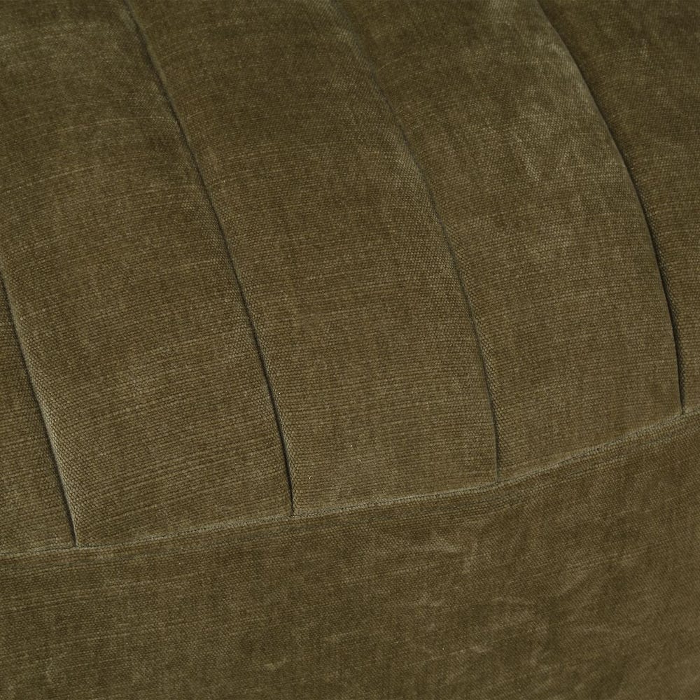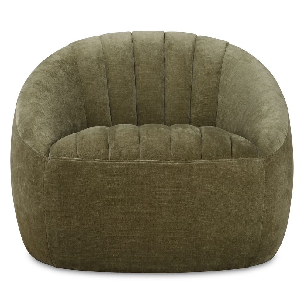 Rich channel stitching adds subtle elegance to this chair, fully covered in a soft, low-pile chambray chenille that mimics vintage velvet in a deep moss green. It sits atop a concealed swivel base for smooth movement.
