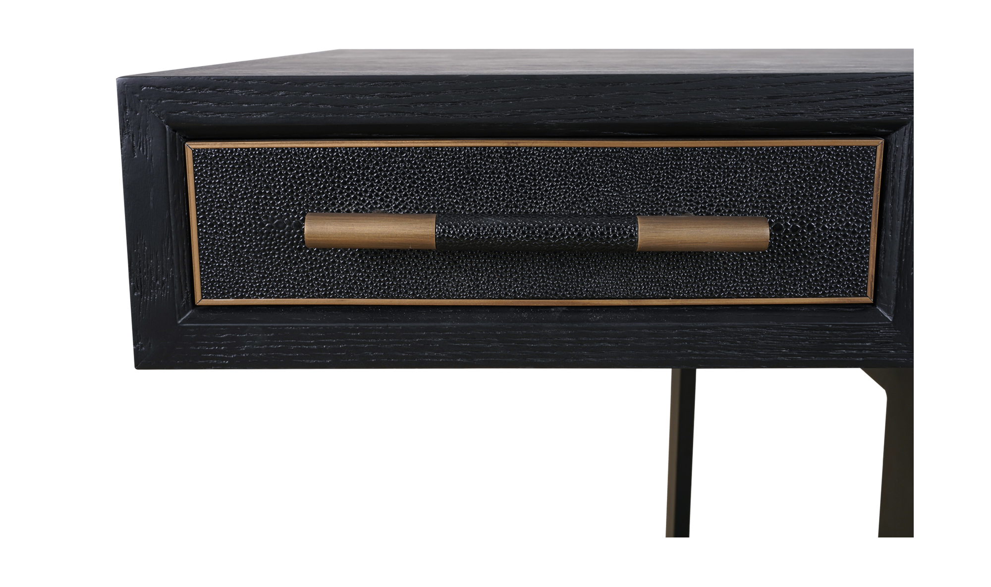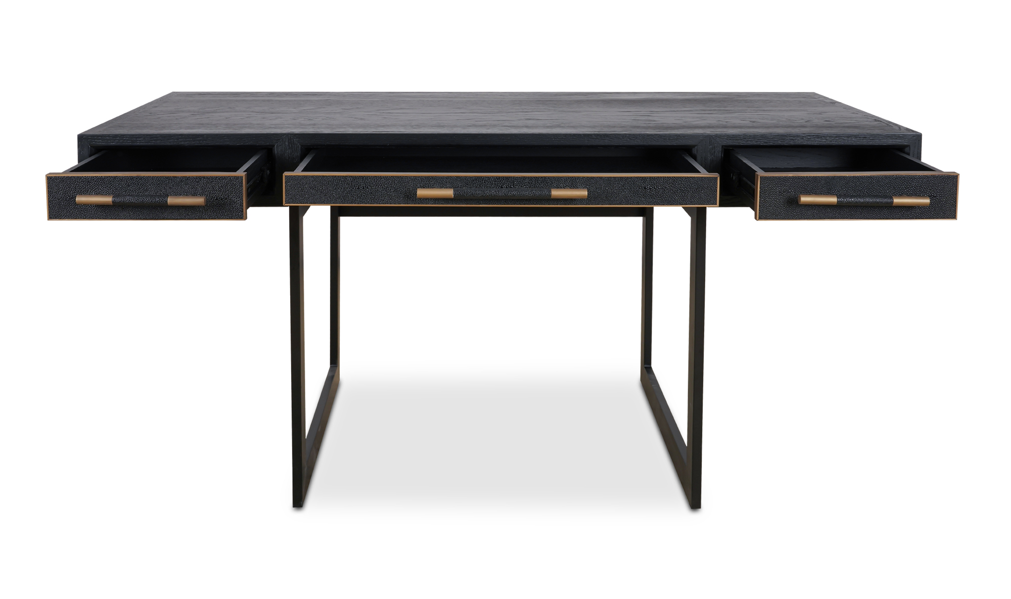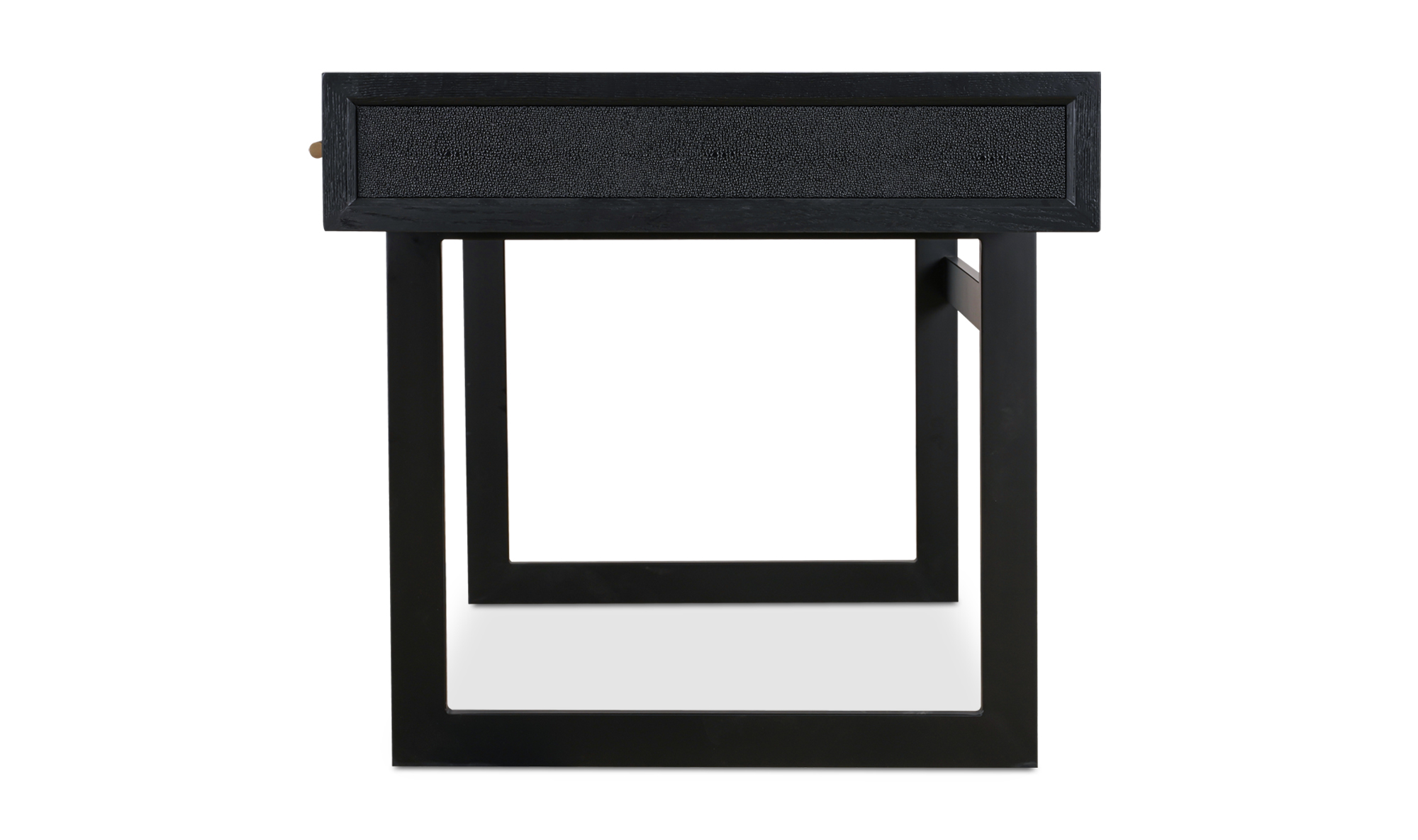 The Mako Desk Black, upholstered in premium vegan leather shagreen, adds sophisticated texture and durability to your workspace. Its sleek three-drawer design provides ample storage, while the spacious tabletop creates an organized and stylish environment. Perfect for both office and living areas, this desk combines functionality with effortless elegance.