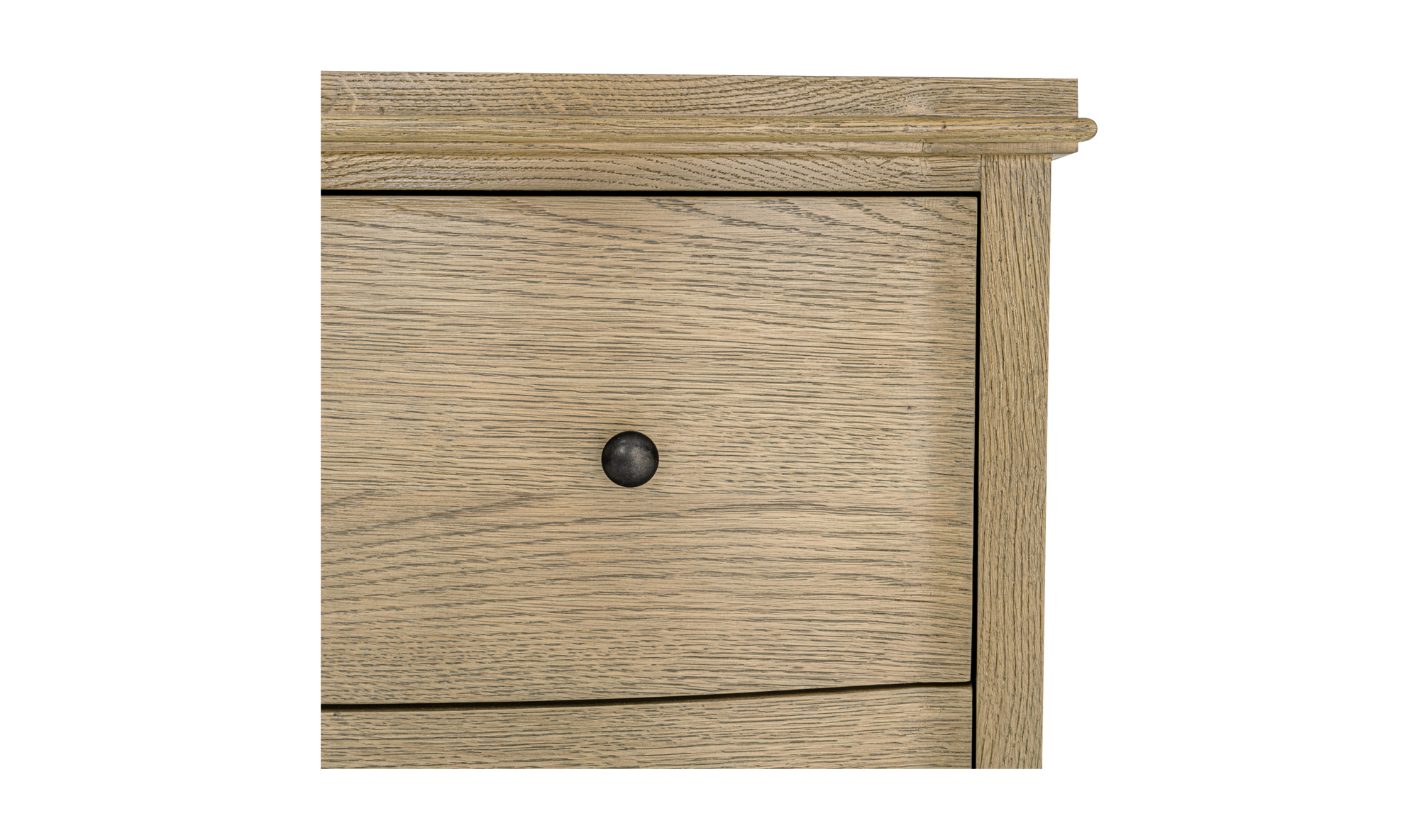 The Sadie nightstand blends modern traditional style with its softly curved design and wire-brushed oak finish. Its elegant overhang features rounded edges and a curved front, creating a calming and refined look. Featuring two roomy drawers with smooth undermounted glides, it offers generous storage while maintaining a sleek profile. Crafted with an oak veneer frame, sides, and drawer interiors, this piece arrives fully assembled for your convenience. Elevate your bedroom with the perfect balance of style and practicality.