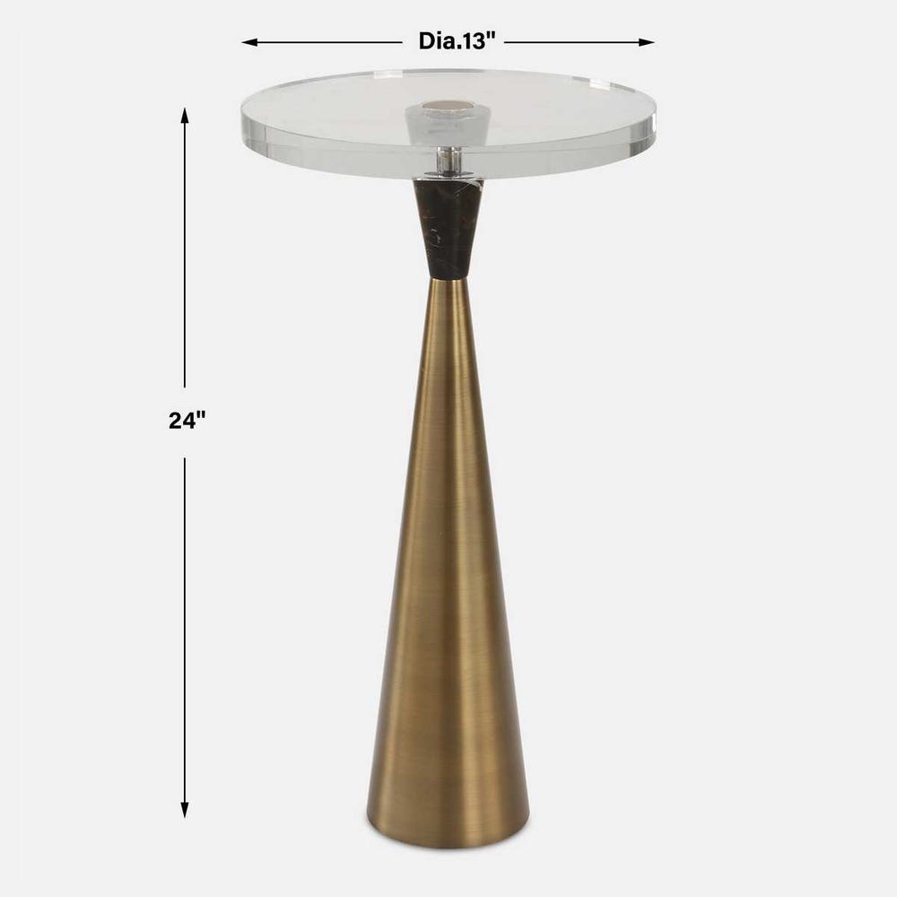 This modern accent table features a crystal surface resting on a tapered metal base finished in brushed brass. Its dark marble highlights with deep chocolate and soft white veins add a touch of elegance to any space.