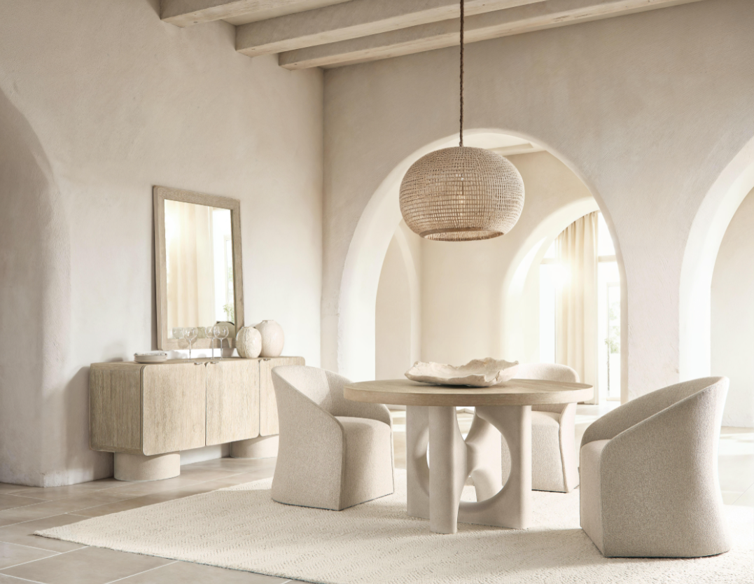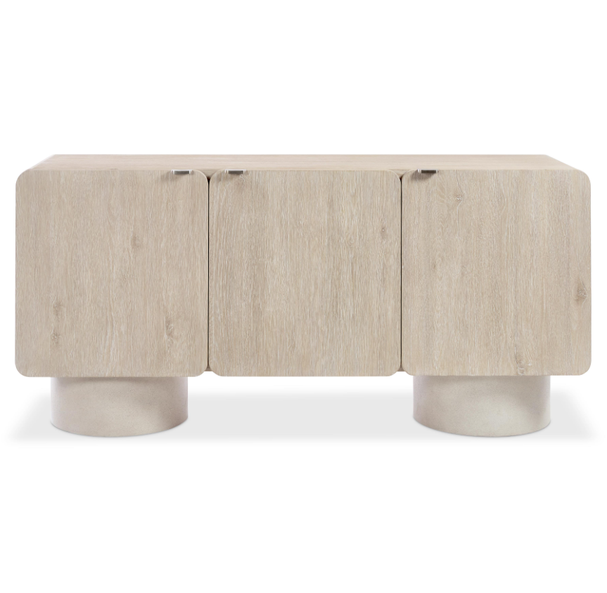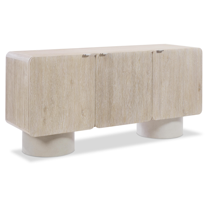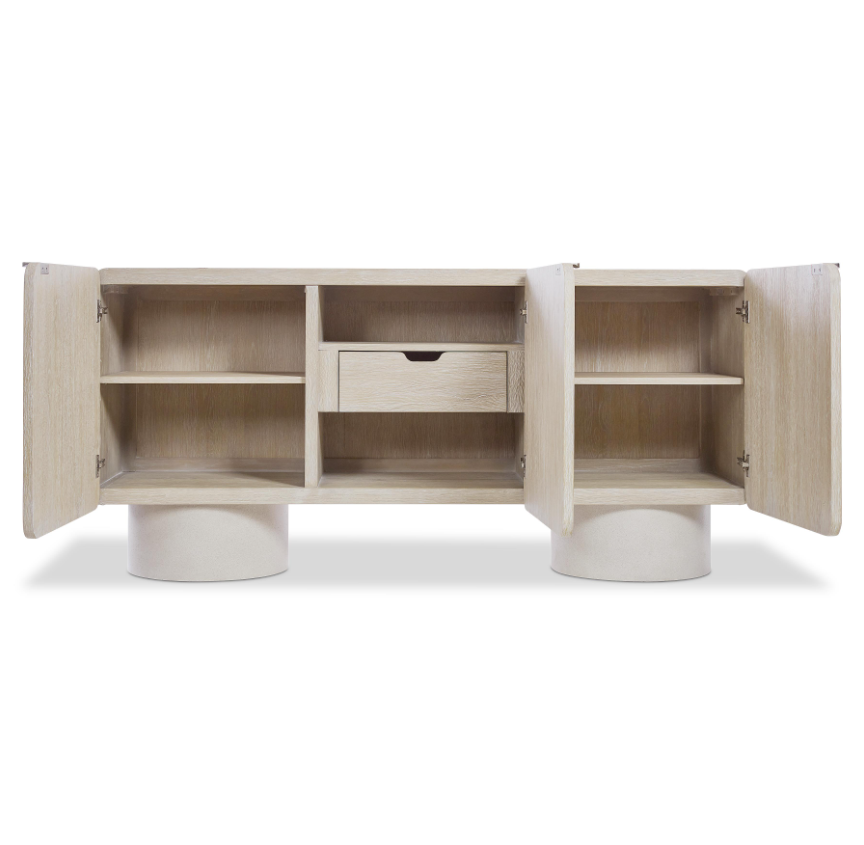 The Antibes Buffet blends modern organic design with natural textures, featuring two round pedestals crafted from glass-reinforced concrete. Its light Roz-finished wooden case offers three smooth pull-to-open doors with elegant cast aluminum tab pulls. Inside, adjustable shelves and a drawer provide versatile storage, making it perfect for organizing your space with style and functionality. Elevate your home with this distinctive, durable buffet that combines artistic craftsmanship and practical design.