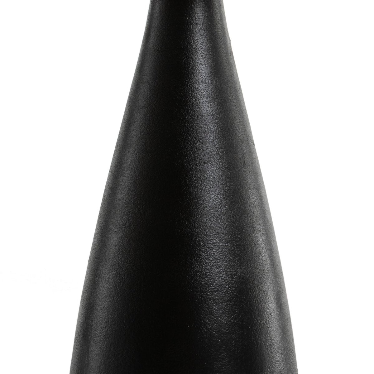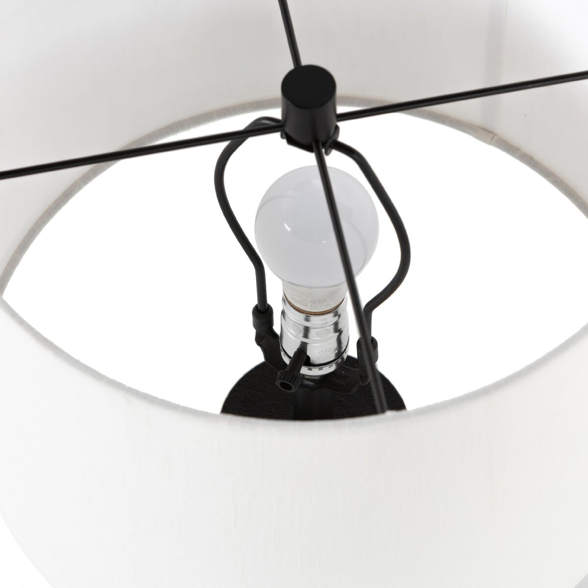 The Innes Table Lamp features a striking textured black aluminum base perfectly complemented by an off-white cotton shade, creating an elegant and eye-catching contrast.