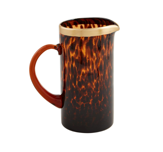 Elevate your table with this elegant tortoise glass pitcher, featuring a delicate hand-painted gold rim for a touch of refined luxury.
