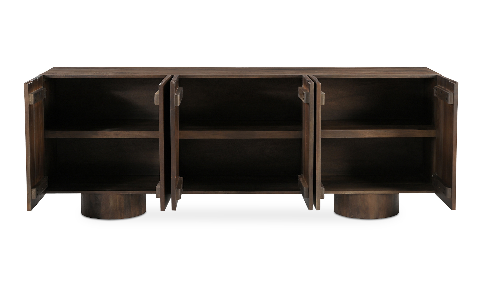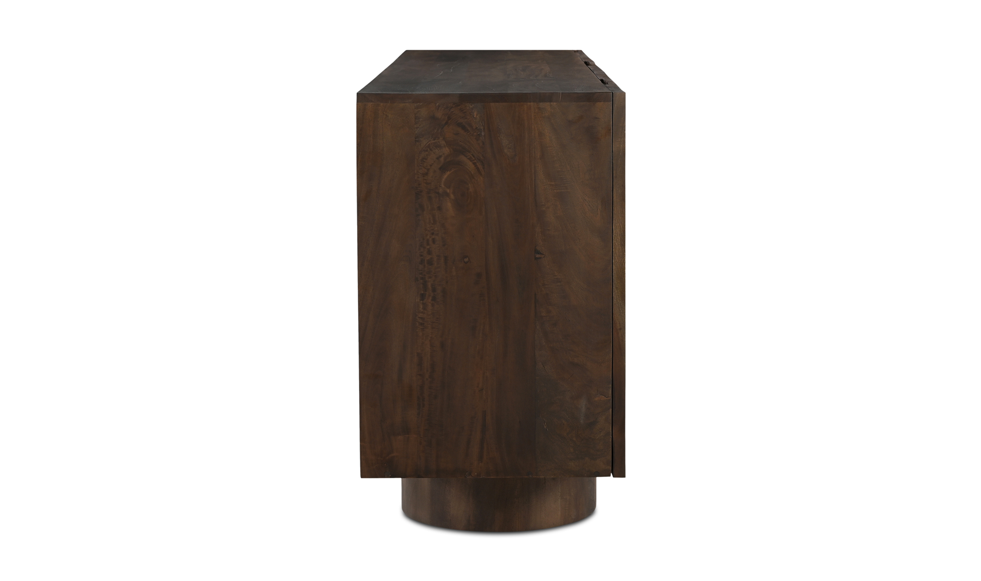 The Hadley Sideboard, made from reclaimed neem wood, showcases a sturdy top supported by solid cylindrical legs, offering a stable presence. Its six spacious doors with built-in handles provide plenty of storage, while the rich warm color and natural wood grain add a cozy, distinctive charm to any room.