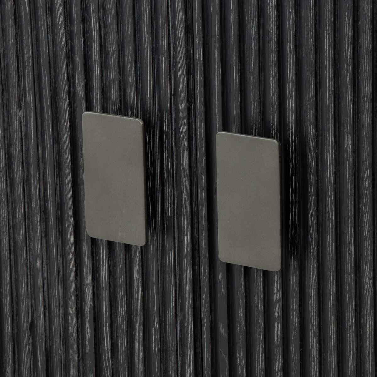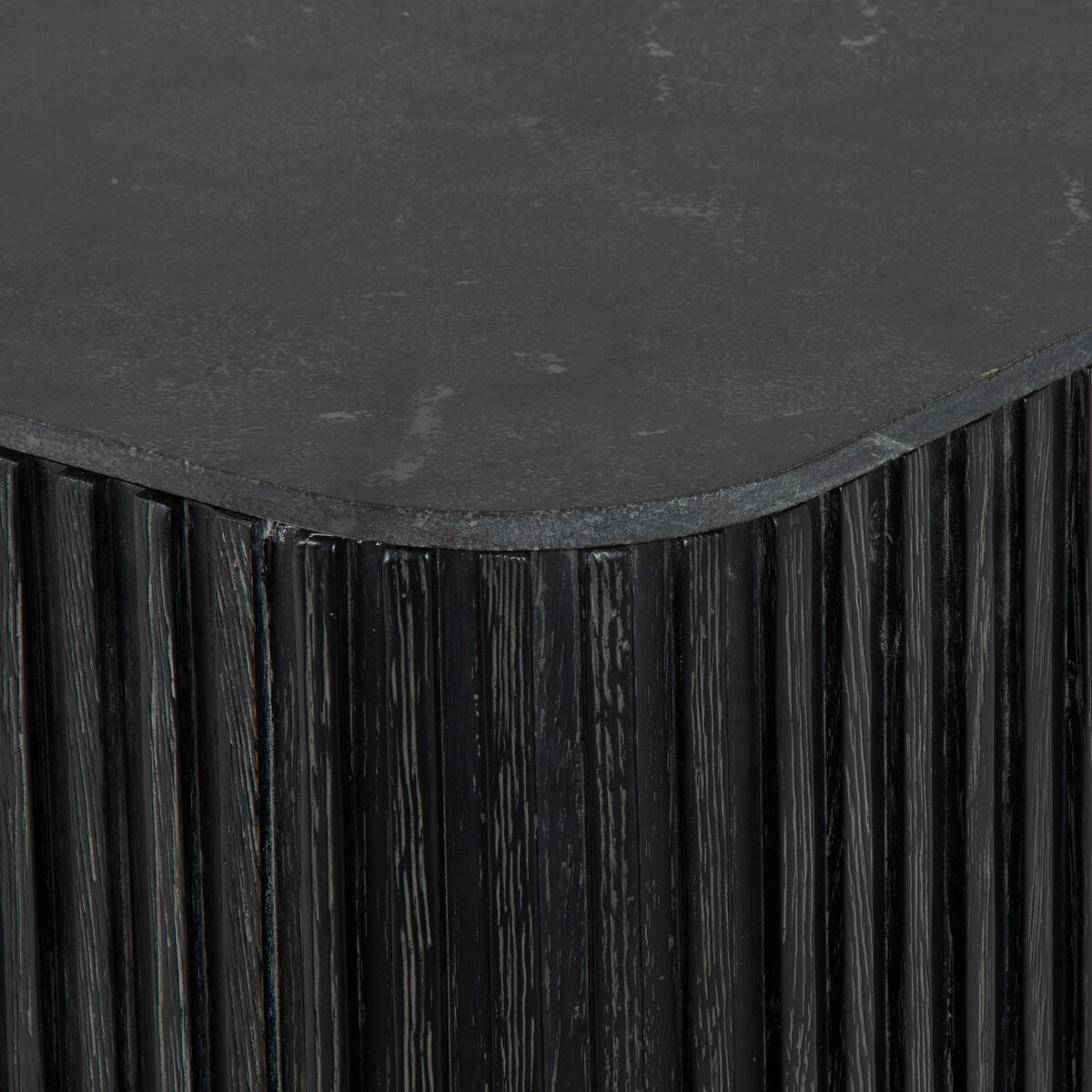 The Laverne Sideboard features a sleek mid-century design enhanced by a blend of materials. Its black oak frame is whitewashed to achieve a ceruse-inspired finish, complemented by vertical reeding that adds depth and character. Topped with smooth bluestone, it introduces an unexpected touch of elegance, while oversized iron hardware brings a modern, bold flair. Built-in cutouts at the back allow for convenient cord management. Natural white mineral streaks and subtle variations in color, texture, and pattern highlight the unique beauty of each stone.