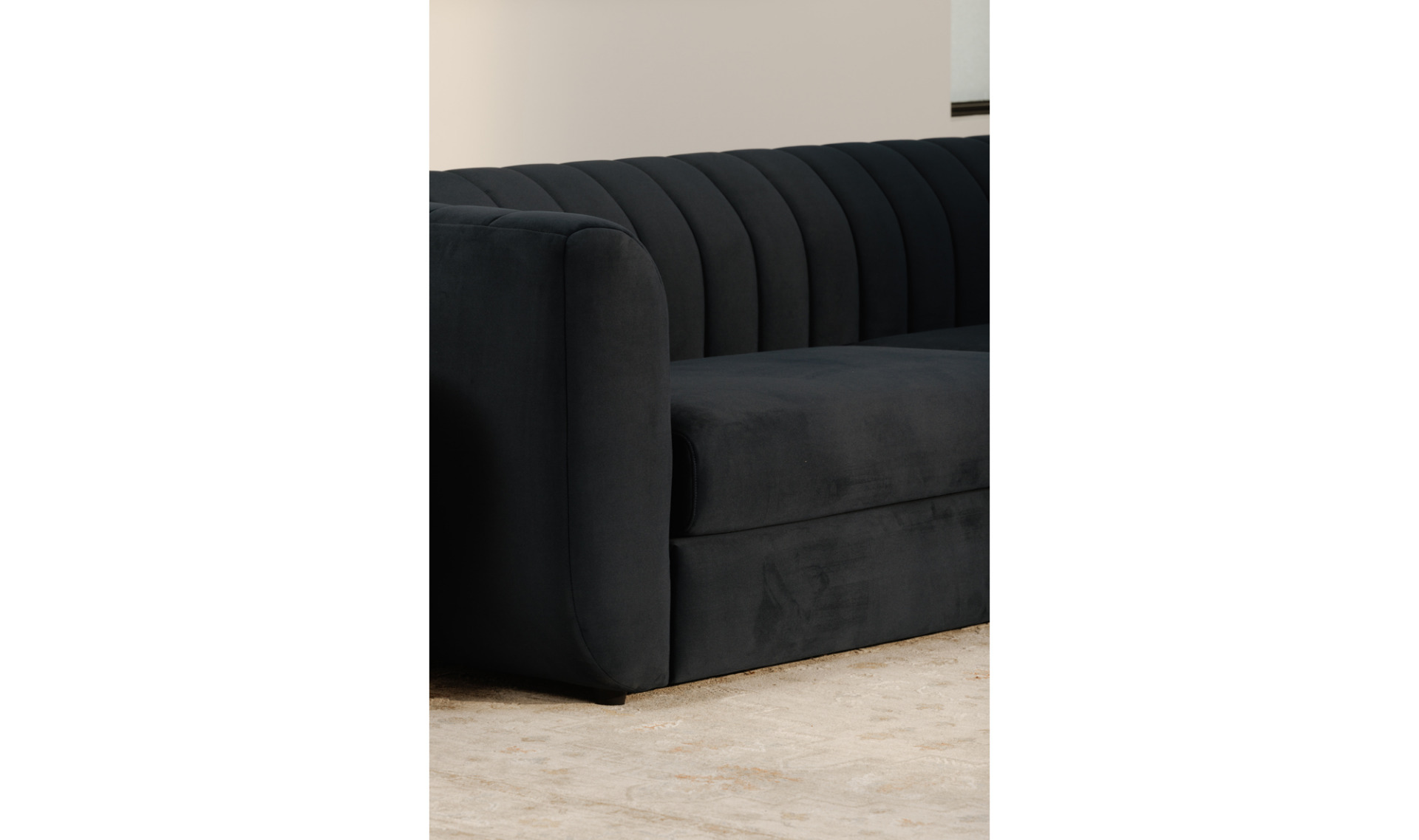 The Rosy Sofa offers unparalleled comfort with its generous, curved silhouette. Featuring wide vertical channels inspired by Art Deco elegance and covered in textured neutral polyester fabric, it brings a contemporary charm to any living room. Crafted with a sturdy plywood frame and a foam-core, polyfill-wrapped seat, it includes removable cushions and comfortably accommodates four people—all without the hassle of assembly.